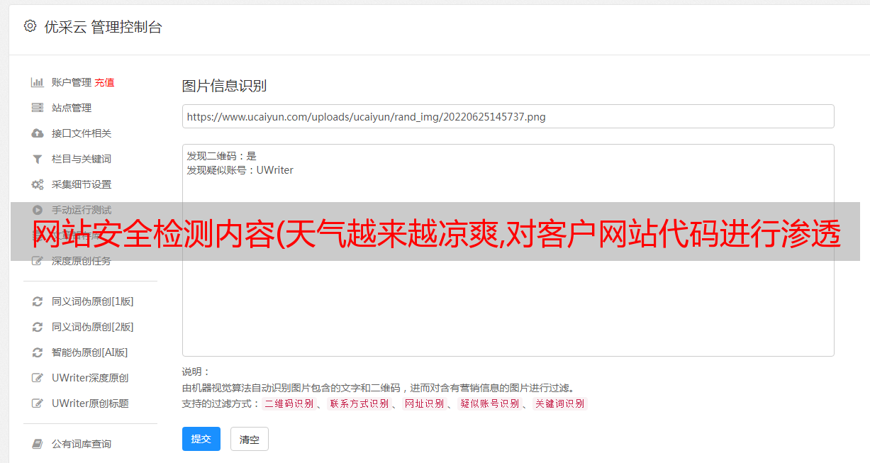 优采云 发布时间: 2021-10-11 12:11网站安全检测内容(天气越来越凉爽,对客户网站代码进行渗透测试漏洞测试)
