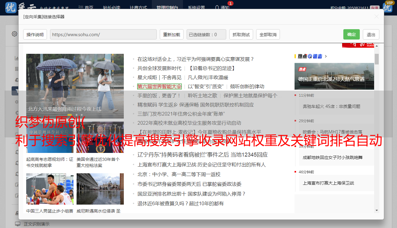 织梦采集侠的功能采集侠官网点击这里下载免费版采集侠采集侠是专业的采集模块拥有先进的人工智能网页识别技术和卓越的伪原创技术,远远超越传统采集软件,从不同的网站采集优质内容自动原创处理减少了网站的维护工作量,大大提高了收录和点击率。是每个网站必备的插件 1 一键安装全自动采集织梦采集安装非常简单方便。 采集 并结合简单、健壮、灵活、开源的dedecms程序新手可以快速上手,我们也有专门的。客服为商业客户提供技术支持。 2 采集这个词不用写采集规则,传统的采集模式是织梦采集可以根据用户设置的优点指定关键词 for pan采集 pan采集 是采集 关键词 的不同搜索结果实现指定的一个或多个不正确。采集站点采集reduces采集 站点被搜索引擎判断为镜像站点被搜索引擎惩罚。 3RSS采集输入RSS地址采集内容只要采集@采集的网站提供RSS订阅地址即可使用RSS采集只需输入RSS地址即可轻松采集到目标网站内容无需写采集方便简单的规则4页监控采集简单方便采集内容页监控采集您只需要提供监控页地址和文字URL规则来指定采集指定网站或者栏目内容方便简单,无需编写和挑