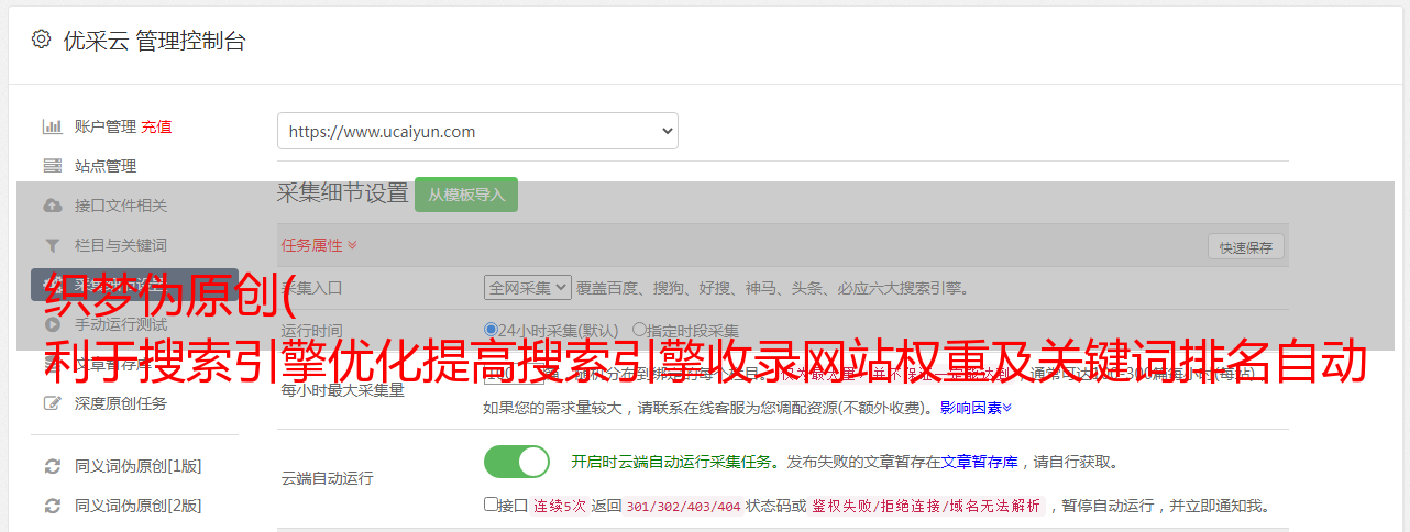 <p>设置规则也可以有针对性的采集 5种伪原创和优化方法提高收录率和排名,自动标题段落重新排列,高级混淆,自动内链内容过滤, URL过滤、同义词替换和插入seo词关键词添加链接等方法增强对采集采集文章原创@返回的文章的处理> 引擎优化提升搜索引擎权重和关键词排名6插件全自动采集无需人工干预织梦采集根据预设设置是采集任务基于设置的采集方法采集 URL然后自动抓取网页内容。该程序使用精确计算并分析网页以丢弃不是文章内容页的URL。精彩的文章内容终于进行了。 伪原创 被导入并生成。所有操作程序均自动完成,无需人工干预。 7 手动发布文章也可以伪原创和搜索优化处理织梦采集下不只是一个采集插件,还是一个织梦必备伪原创和手动发布的搜索优化插件文章可以通过织梦采集侠的伪原创和搜索优化处理可以进行同义词替换文章,自动在关键词链接和文章中插入链接。 关键词会自动添加指定链接等功能是织梦必备插件8个定时定量采集伪原创SEO更新插件有两个触发器
