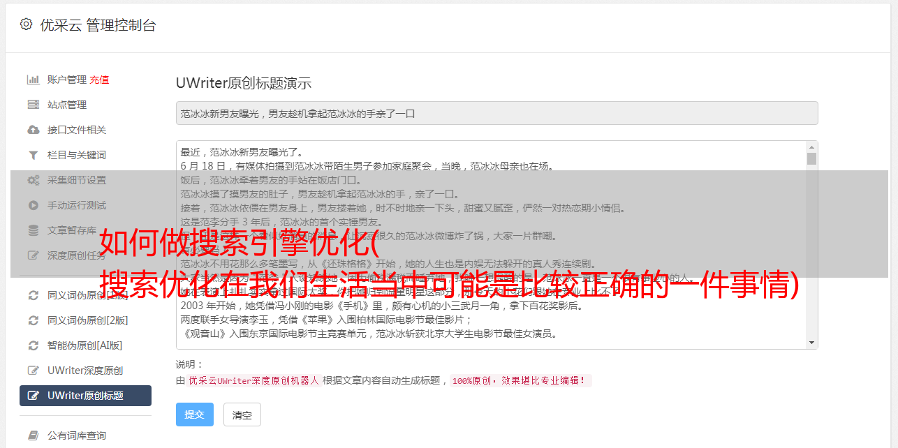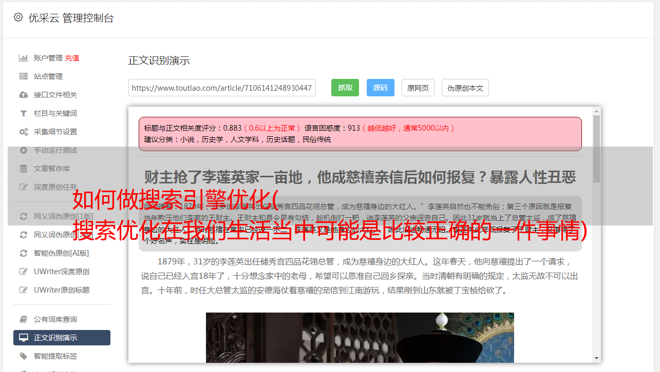 在搜索优化中,可以有效增加网站的权重,推动关键词的布局或利用词库进行有效的建设,作为整个企业搜索引擎优化的技术,可以高质量做内容创作。可以有效把握关键词的内涵和品质,从内容部分可以看出。搜索优化基于 文章 属性和 文章关键词 布局。可以进行有效的分析。文章 属性可以看作是平台中一个重要的内容属性。在进行搜索优化时,原创的内容相对于文章的原创内容具有绝对优势,并不是所有平台都有足够的原创内容。