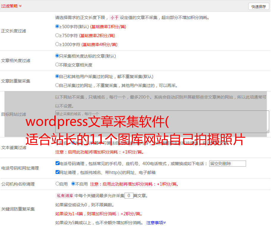 最后一个设置是过滤规则。支持按照指定的顺序、大小、格式和域名过滤外链图片采集。