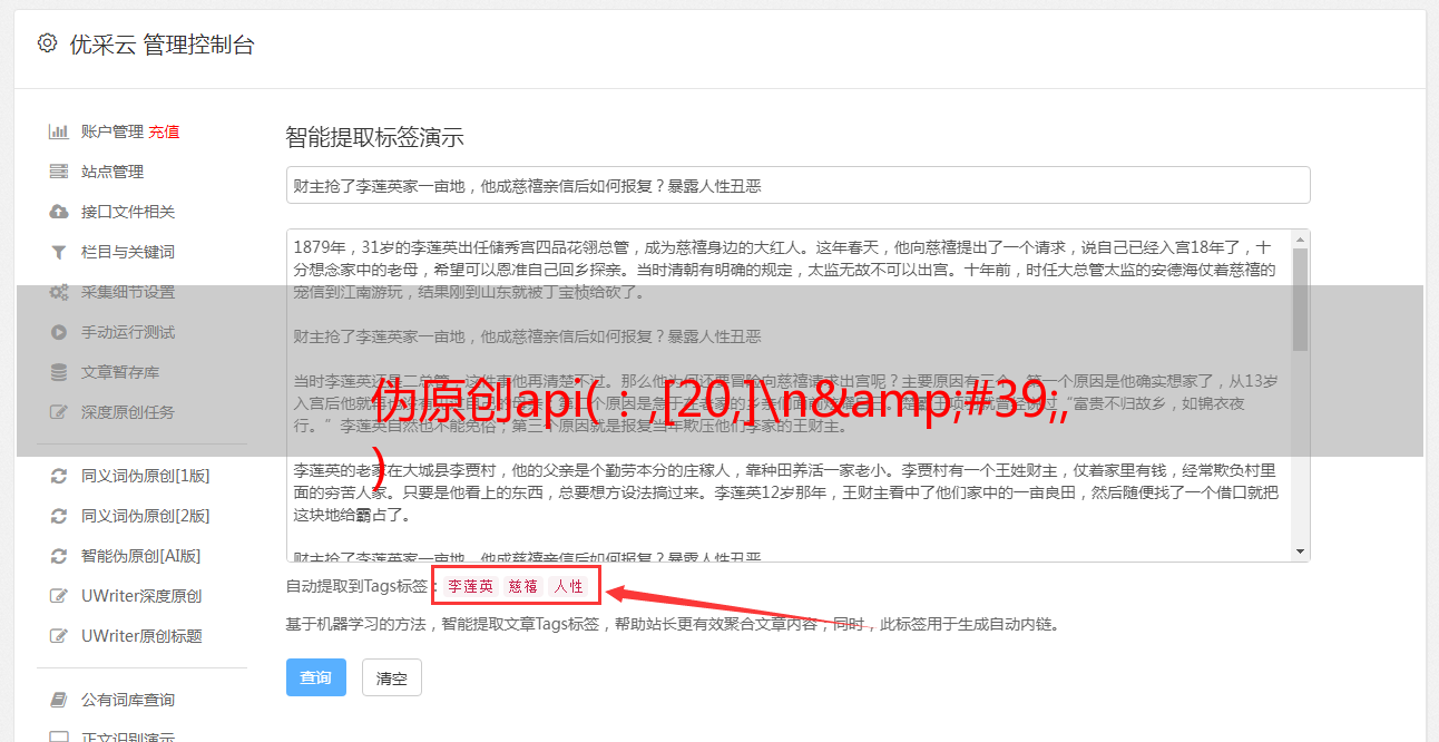 优采云 发布时间: 2021-10-13 09:36伪原创api(:,[20,]\n',