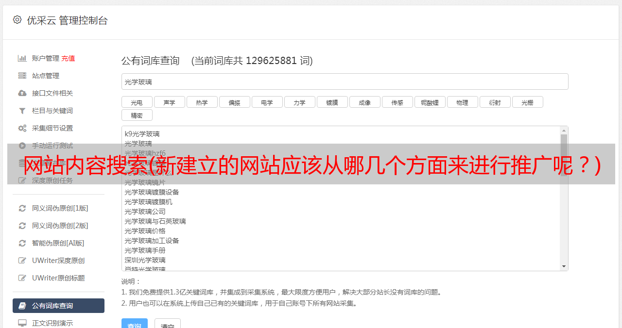 优采云 发布时间: 2021-10-13 18:34网站内容搜索(新建立的网站应该从哪几个方面来进行推广呢?)