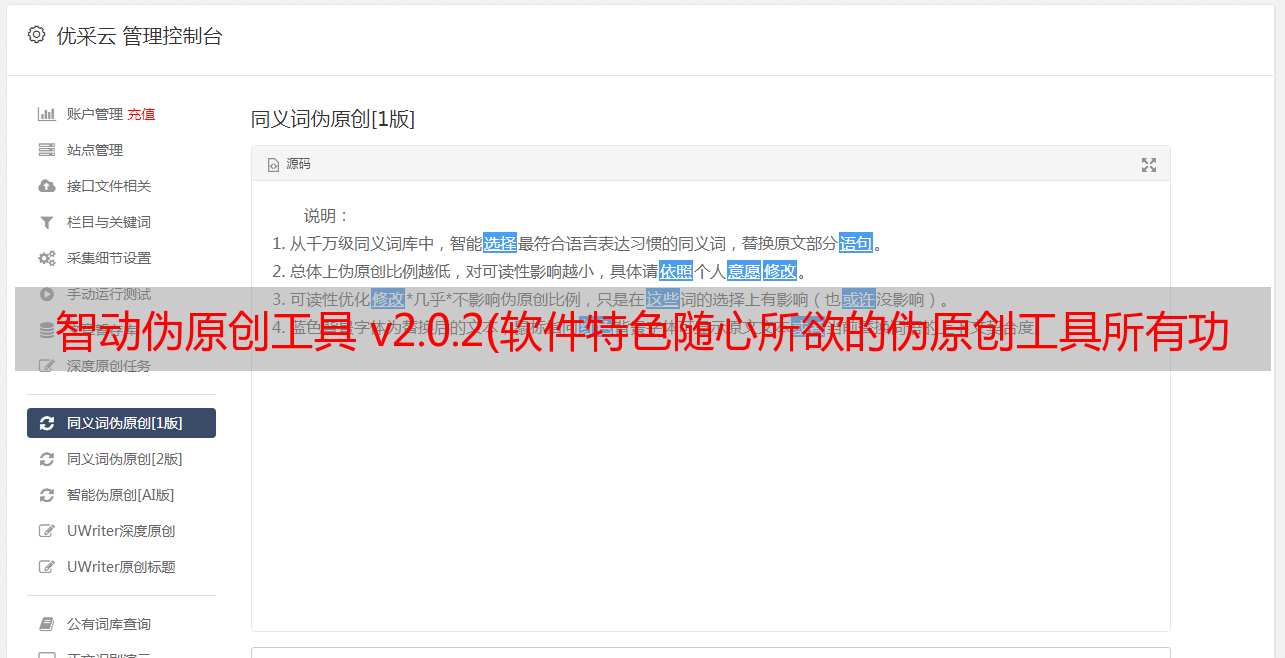 优采云 发布时间: 2021-10-14 15:18智动伪原创工具 v2.0.2(软件特色随心所欲的伪原创工具所有功能您都可以自己定义设置)