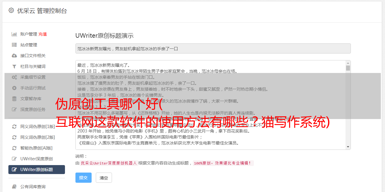 这里需要用到一些伪原创工具。之前分享过优采云人工智能写作系统。就是为了解决广大朋友不会写文章的问题。当然,改用任何工具。不用人工编辑,无论伪原创工具生成的文章多好,都会有很多错别字和病句。