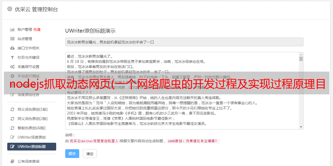 优采云 发布时间: 2021-10-14 22:14nodejs抓取动态网页(一个网络爬虫的开发过程及实现过程原理目标分析)
