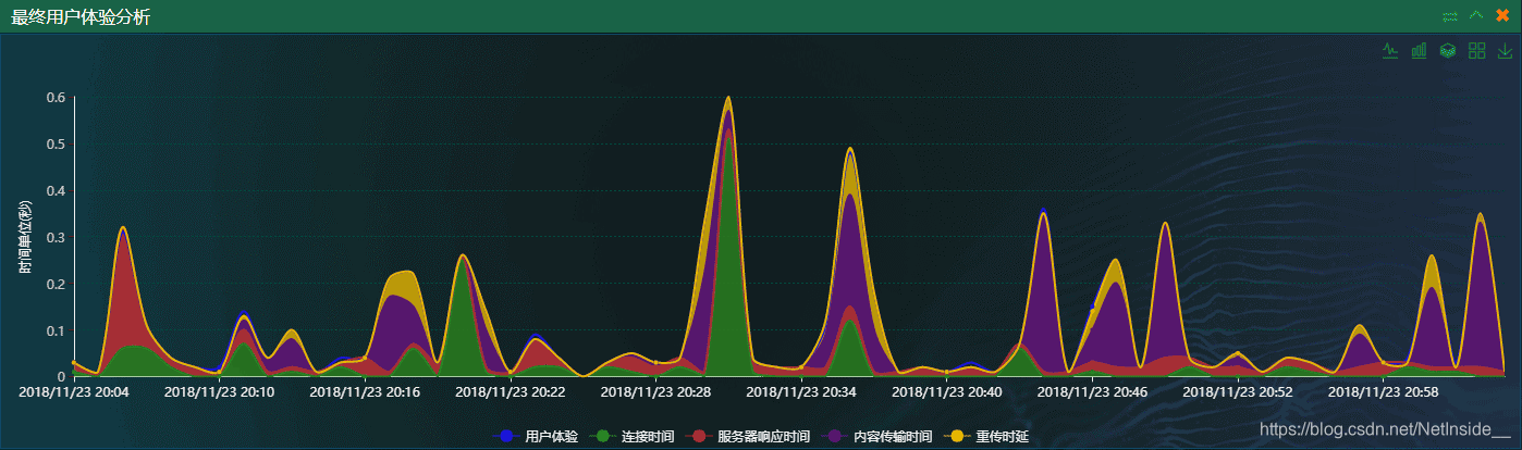 下图是网深科技NetInside网路流量剖析系统对响应时间的剖析结果,通过这些直观的剖析,系统对客户端访问服务器过程中能形成的所有时间信息,如联接构建的时间、服务器响应时间、数据传输时间,重传时间等等。通过图形形式,一目了然。