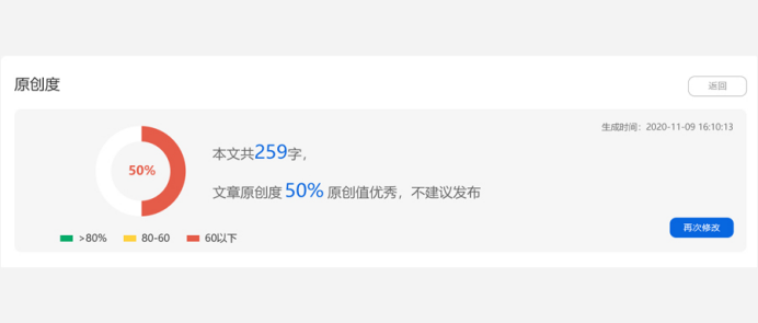 原创度检测,能使各大品牌主在投放内容前,查看自己品牌的文章和竞品的相比,是否有洗稿之嫌,对文案有更深刻地理解,才能更好的对文章进行优化修改,使文章更好的被收录。