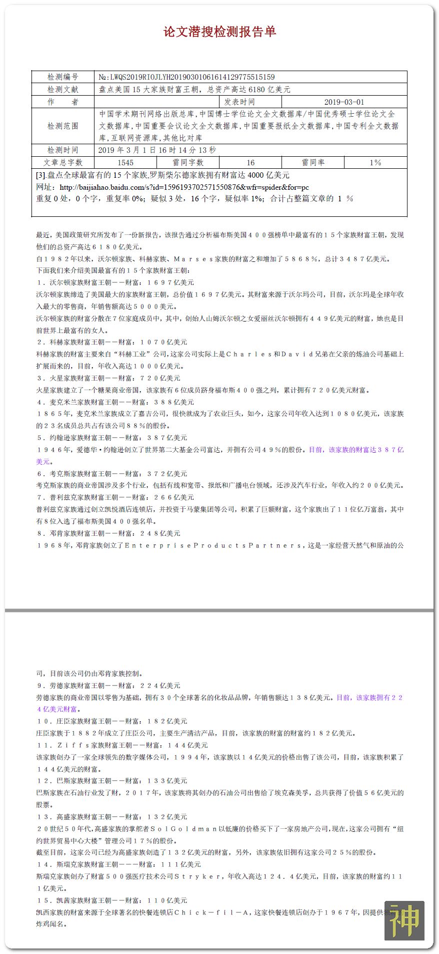 如上图所示,我们可以看到这篇文章的总体相似度为1%,也就是说它的原创度为99%,如果文章相似度太低,那么一定是出现了很多雷同内容。