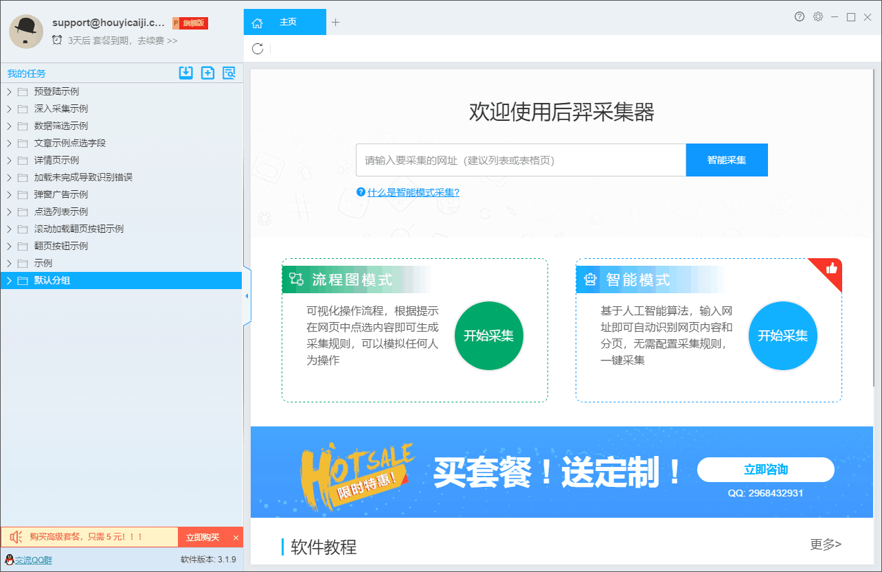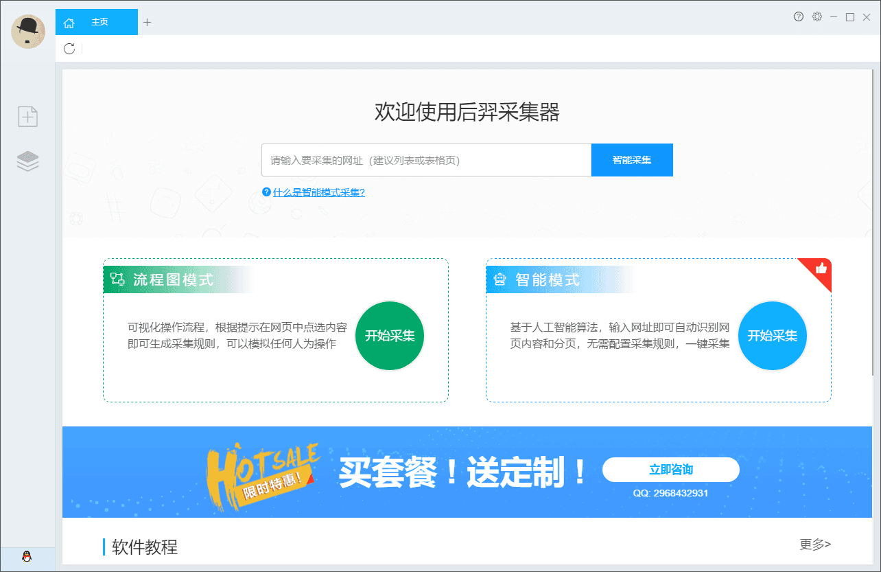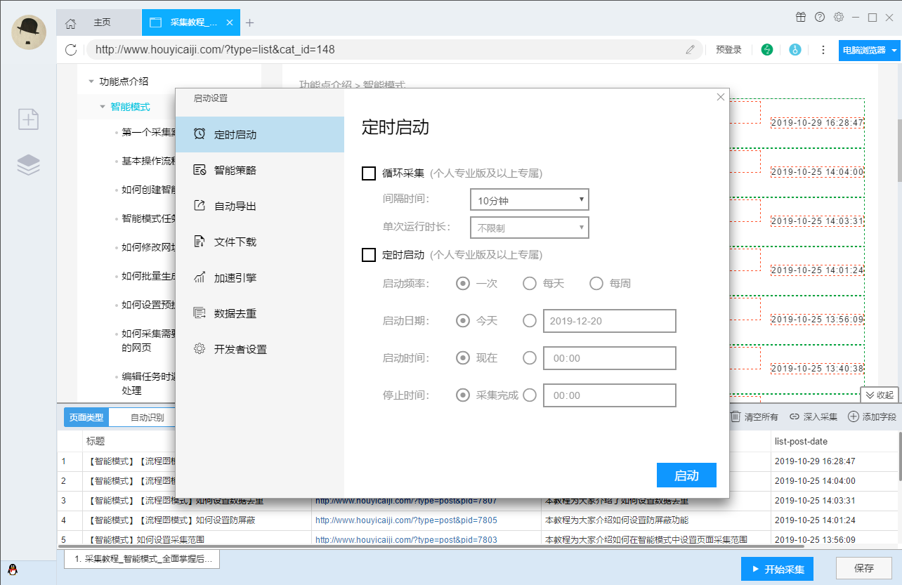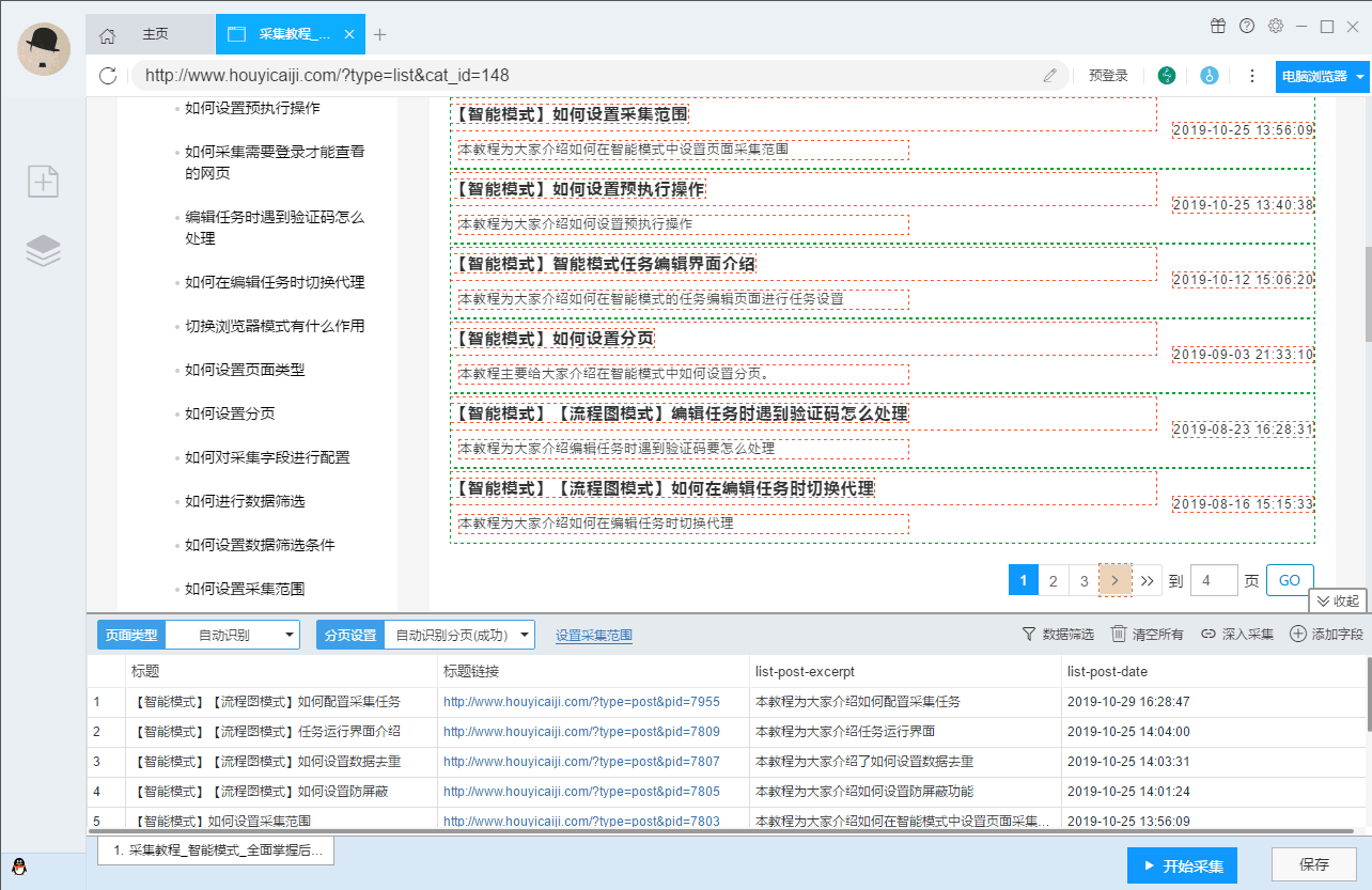 智能模式:基于人工智能算法,只需输入网址即可智能识别列表数据、表格数据和分页按钮,无需配置任何采集规则,一键采集。