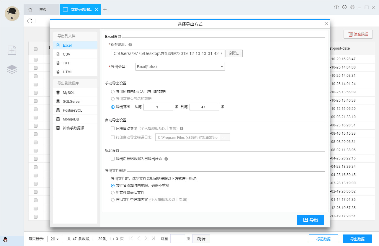 采集 结果可以本地导出,支持TXT、EXCEL、CSV和HTML文件格式,也可以直接发布到数据库(MySQL、MongoDB、SQL Server、PostgreSQL)供您使用。
