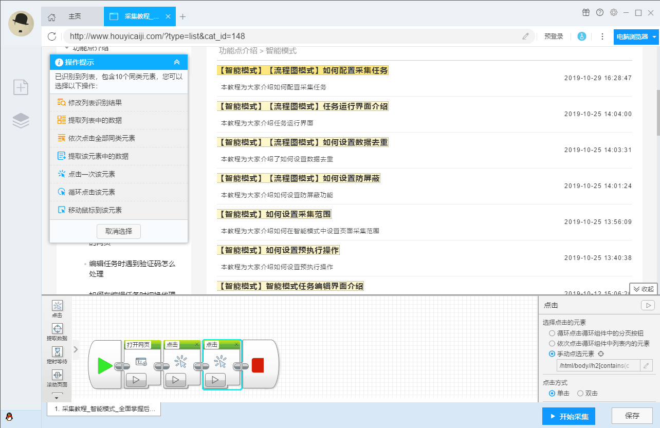 流程图模式:只需点击页面,根据软件提示进行操作,完全符合人们浏览网页的思维方式。一个复杂的采集规则可以简单几步生成,结合智能识别算法,任何网页的数据都可以轻松采集。