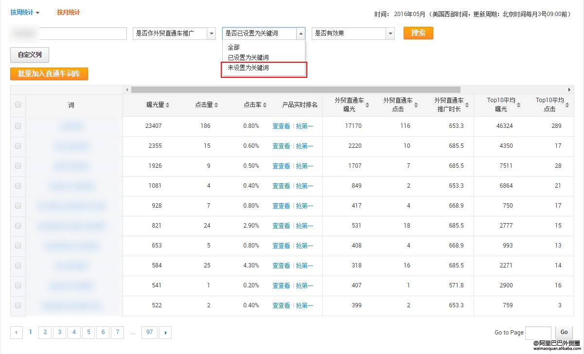 你发布的产品会积累很多的曝光关键词,有一些是你已经整理过的,有一些是新出现的,阿里巴巴会保留3个月的数据,你可以每周或每月去整理一次,把有用的关键词收集下来。