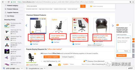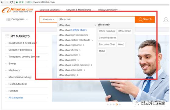 阿里巴巴下拉框所出现的相关关键词都是搜索频率比较高的词语/长尾词。例如你是做办公椅的,输入office chair 下拉的词语都可以作为初期关键词收录。
