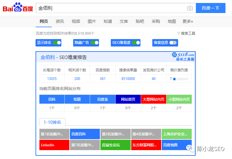 1、搜索行业主关键词,搜索结果前5页的网站基本上可以说明该行业的概括。比如:SEO 这个关键词排前50名的基本上都是非常专业的站点,而且绝大部分是主域名,域名中包含 SEO 的居多。