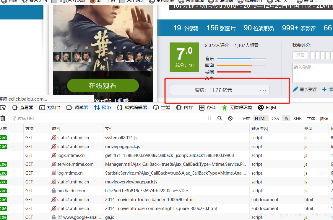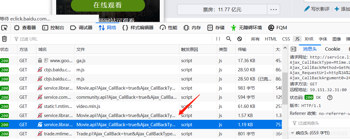 页面中的票房信息无法以 HTML 格式获取。是通过js动态加载得到的,然后搜索对应的js响应。就是从一堆js请求中查看一些收录ajax字段的请求。%3A%2F%%2F242129%2F&t=27406&Ajax_CallBackArgument0=242129