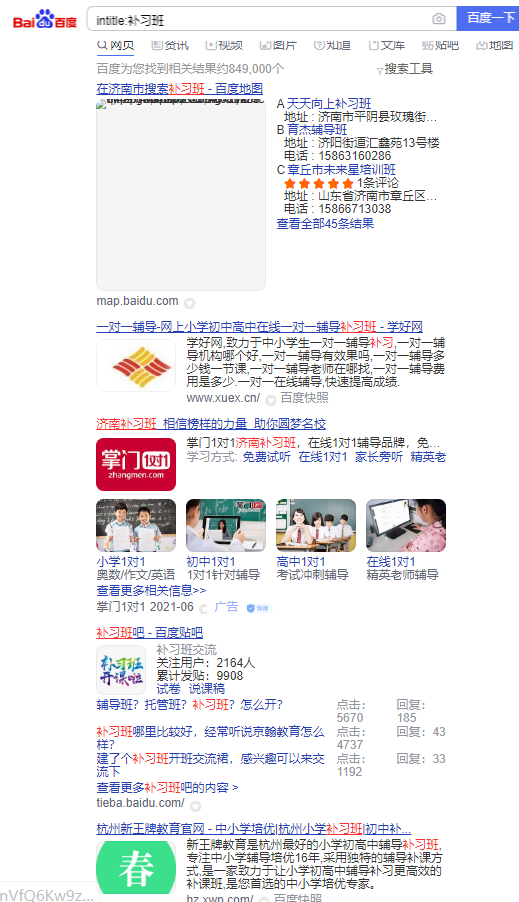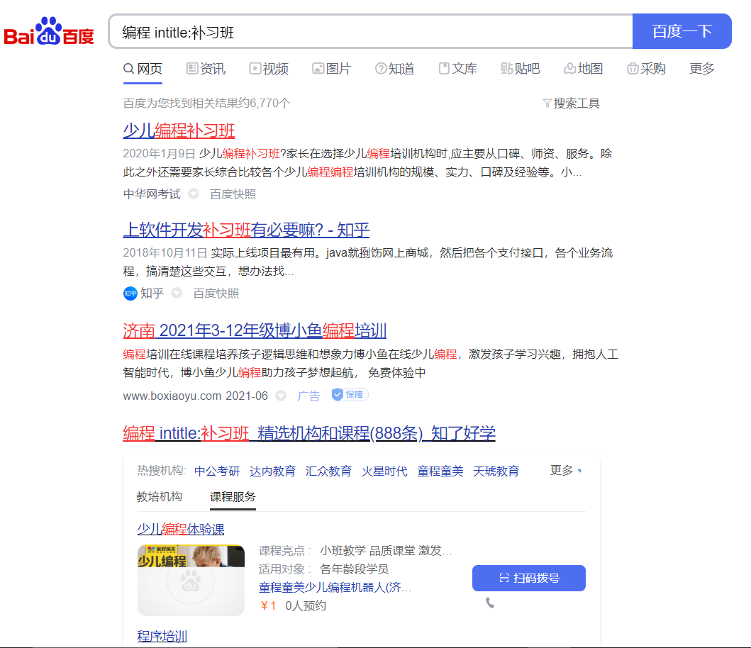 在标题为补习班的网页中搜索“programming intitle: cram school”返回:搜索“programming”关键词的结果。
