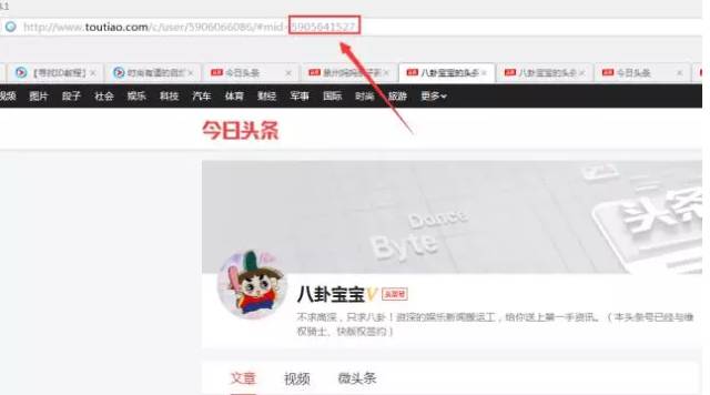 把今日头条上阅读量常常超过几十万、上百万的头条号的ID给记录下来,保存到软件目录。那么如何找头条ID呢?请看下图。