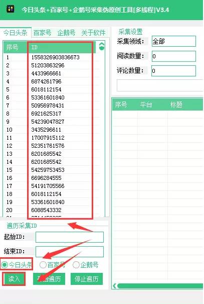在第一步的ID号采集后,就可以把采集到的头条ID批量读入到软件中。怎么读呢?先选择好平台“今天头条”,再点“读入”按钮。