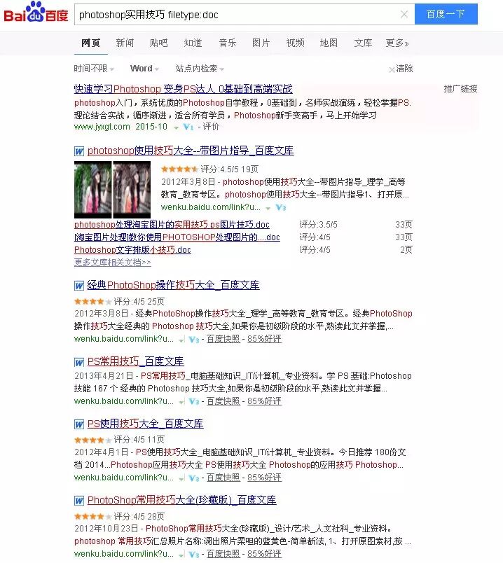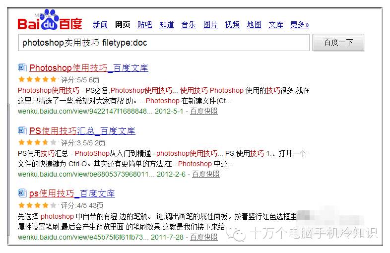 例子:photoshop实用技巧 filetype:doc 就可以搜索所有的word文档!