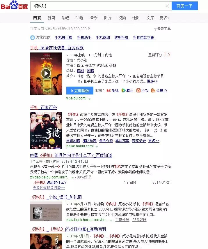 查询词加上书名号《》有两层特殊功能,一是书名号会出现在搜索结果中;二是被书名号扩起来的内容,不会被拆分。 书名号在某些情况下特别有效果,比如查询词为手机,如果不加书名号在很多情况下出来的是通讯工具手机,而加上书名号后,《手机》结果就都是关于电影方面的了。