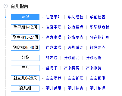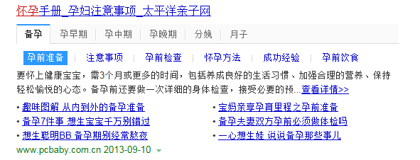 以“怀孕”为例,百度工程师对“怀孕”这个事件主题的顺序关系,进行了较完整的罗列展示,使用户在浏览时能够清晰的明白整个过程: