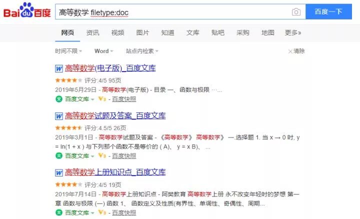 比如我们想在网上搜索高等数学课doc格式的文章,我们可以这样搜索:高等数学 filetype:doc,如下图: