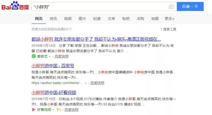 比如我要搜索:小胖穷,在搜索的时候很有可能会把”小胖“和“穷”拆分开,然后分别进行搜索,这时候我们可以把关键词放入引号内,就代表完全匹配搜索,也就是所显示的搜索结果一定包含完整的关键词,不会出现近义词和拆分的情况。