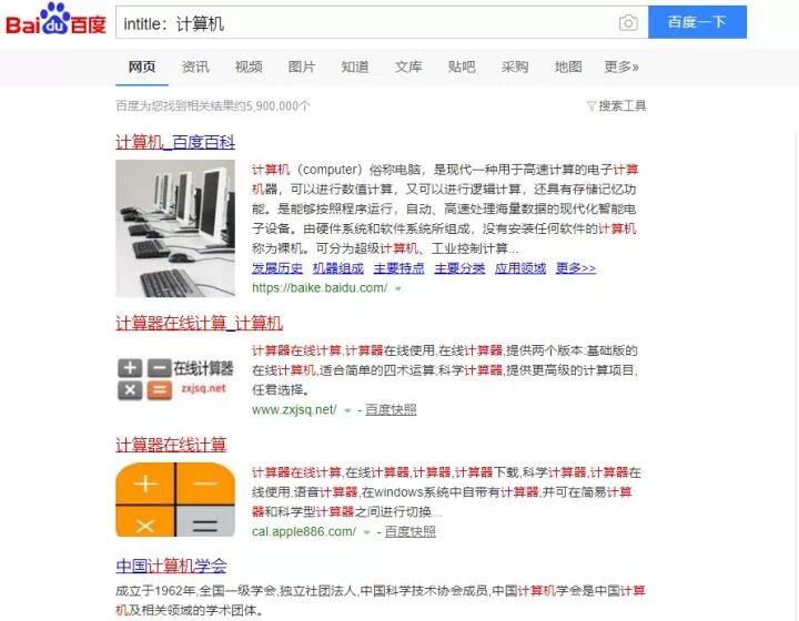 比如我想搜索引擎返回的结果在标题里面包含“计算机”这个关键词,可以输入关键词:intitle:计算机。如下图: