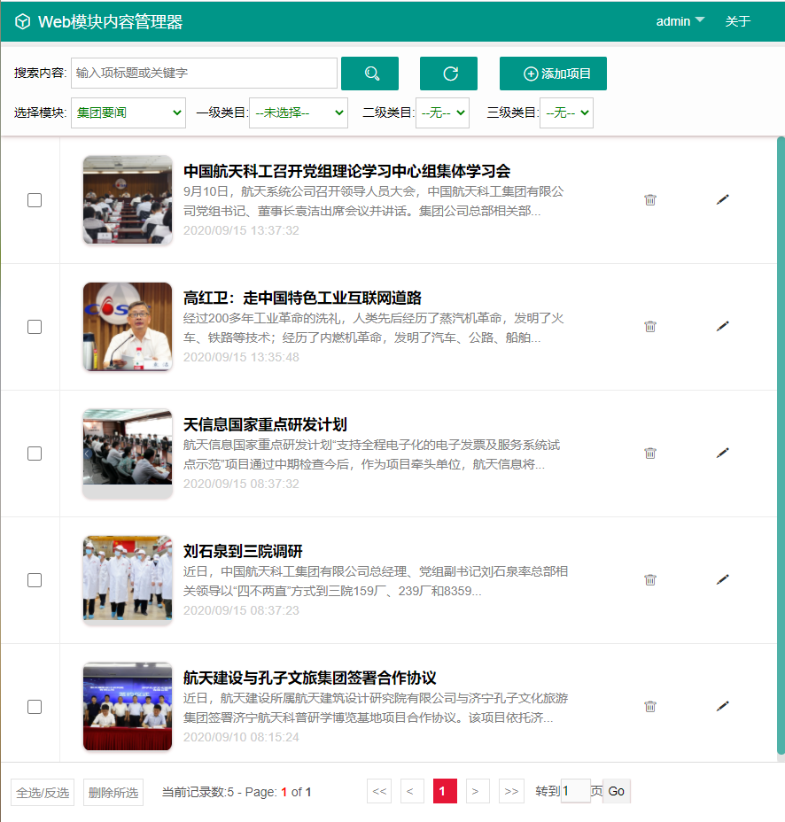 简化文章发布入口的操作流程,图标化模型切换菜单,发布按钮,文章状态,支持文章list,文章搜索,批量操作,右键菜单,AJAX分页和点击, 权重、发布者和发布时间经过 AJAX 过滤和排序。