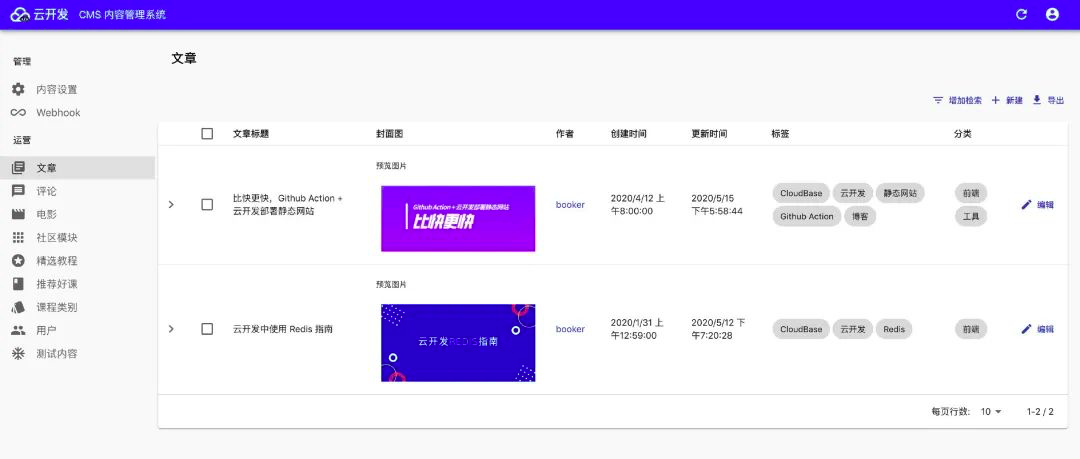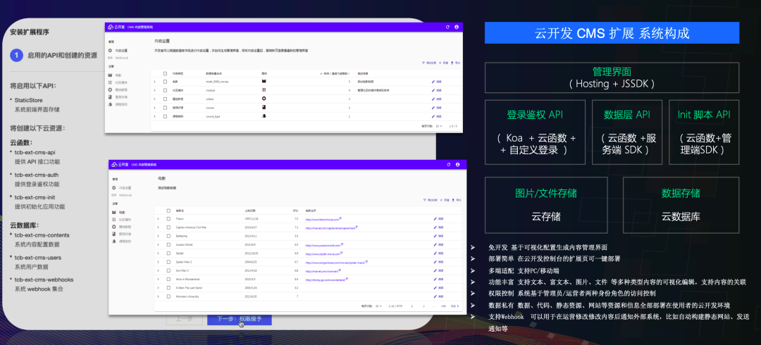 云开发cms内容管理系统是云开发提供的扩展程序,在云开发控制台上一键安装到自己的云开发环境中,方便开发者和内容运营商管理随时随地的小程序。 Web等多端云开发内容数据。它可以在不编写代码的情况下使用。还提供PC/手机浏览器访问支持,支持文本、富文本、图片、文件、关联类型等多种可视化编辑。