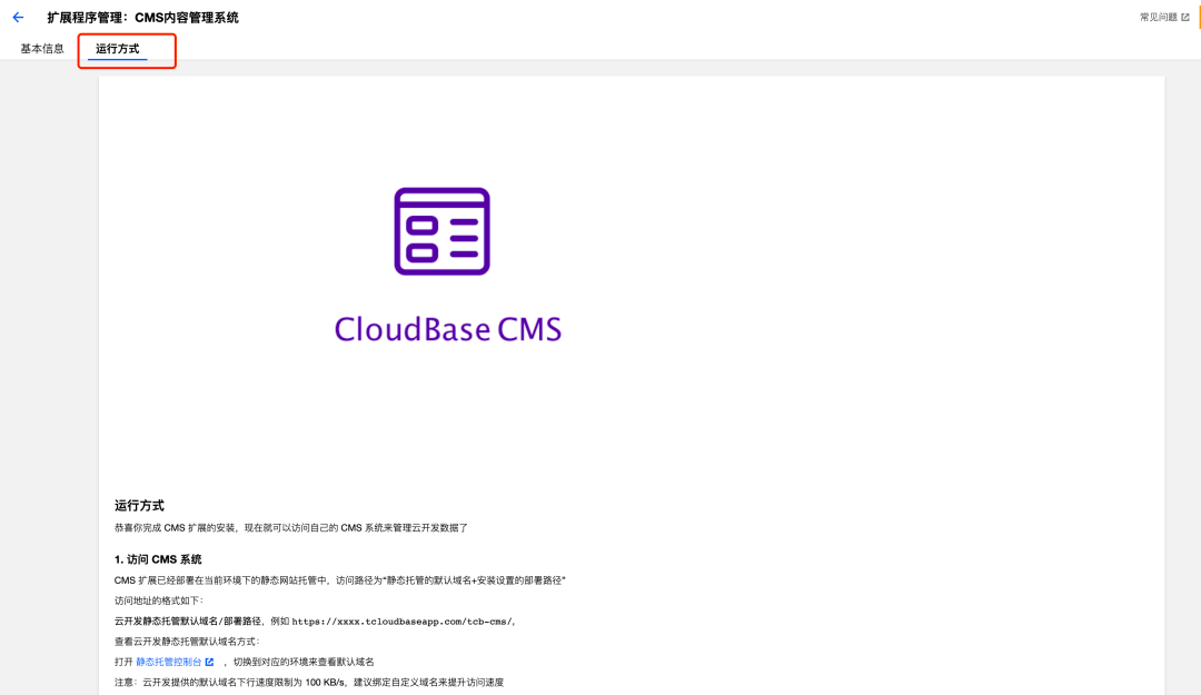 完成【cms内容管理系统】安装后,进入扩展管理页面,可在【扩展操作模式】标签查看使用指南,按照文档完成使用来自cms。这里是一个简单的介绍。更多上手步骤请参考操作模式。