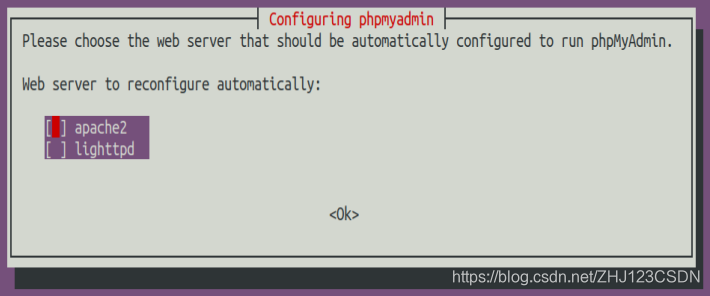 这一步用于选择在哪个服务器上配置pypmyadmin,所以需要选择apache服务器。选择apache2并回车确认。