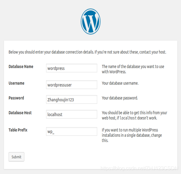 数据库名称数据库用户名数据库密码数据库地址配置表(如果要在一个数据库中运行多个WordPress)