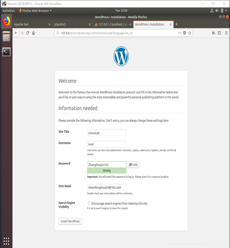 该界面提示您填写一些必要的安装信息,包括站点名称、用户名、密码、邮箱、是否支持搜索引擎索引等,我填写的信息如上图所示。填写完毕后,点击Install WordPress。