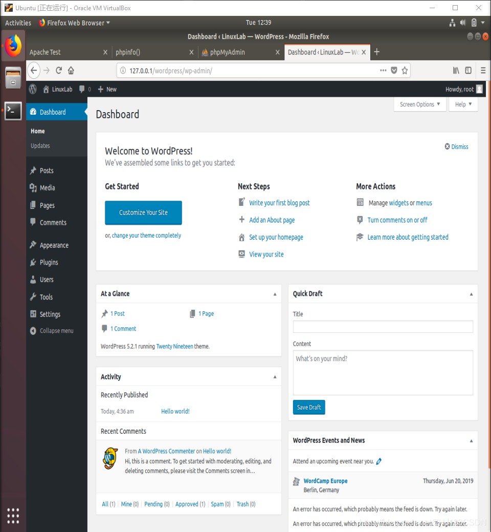 点击保存登录信息并登录,终于出现了WordPress的后台管理界面!
