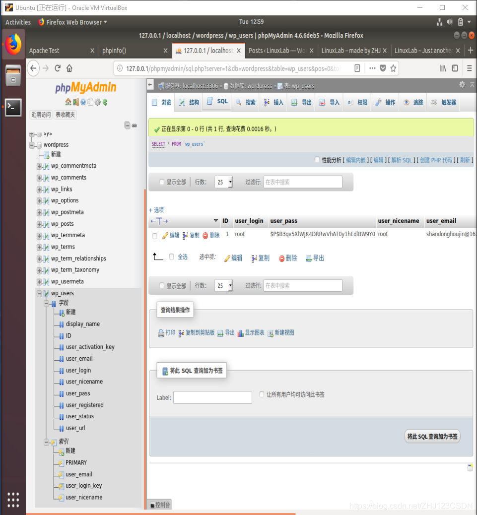 现在您可以查看数据库。刚刚创建的WordPress数据库中已经创建了很多数据表。这些数据表是刚才配置WordPress的时候创建的,用来记录网站的各种动态数据。