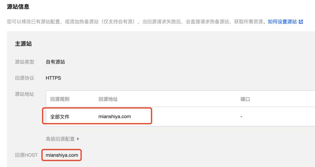 然后要给该域名配置回源地址和回源 HOST,如果 CDN 还没有缓存你的文件,则会从该地址拉取源文件。回源 HOST 主要是为了告诉源站你是谁、是谁要从我这拿文件,从而返回给你正确的资源。