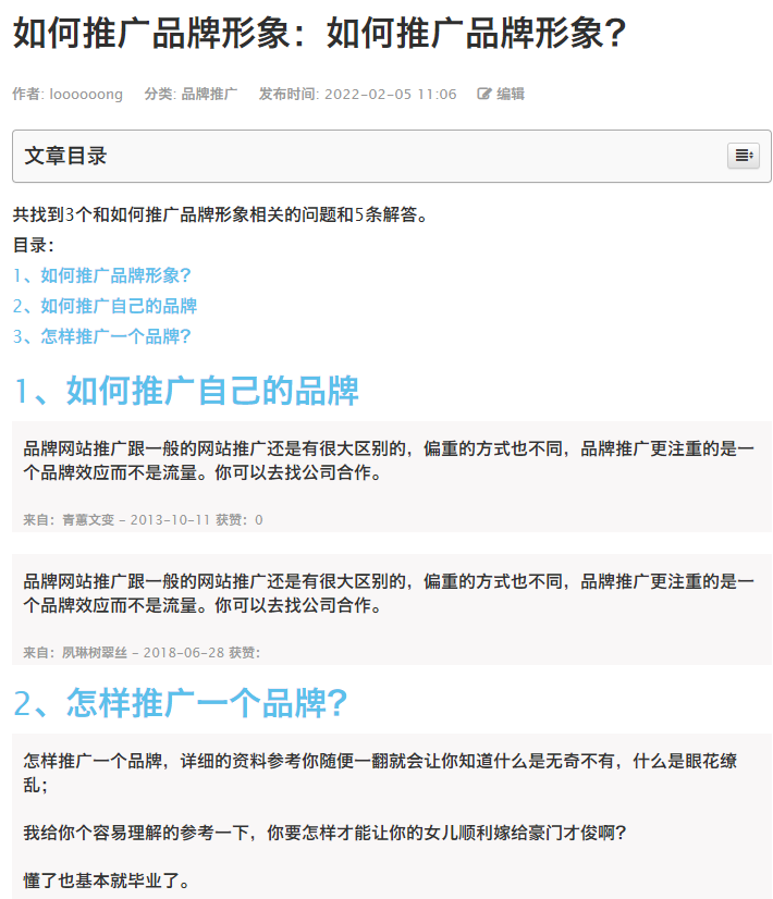文章组成除了采集来的问题和回答,还有很多程序产生的独有数据,如关键词、问题数量、回答数量、回答用户名、回答时间、点赞量等。这些内容可以组成一个独有的头部介绍内容。如下图。