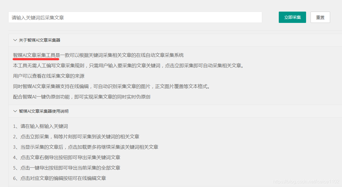 我使用的文章采集伪原创工具是智讯ai伪原创tool。不要从字面上将其解释为伪原创 工具。其实不是,这个伪原创工具还有采集文章的功能。如果你需要采集文章,你只需要找到上面的【在线文章采集】功能,你想使用文章哪个行业类型,输入关键词就采集即可你如果想要文章内容,然后同步伪原创,那么这些文章内容就会转化为你的原创内容。