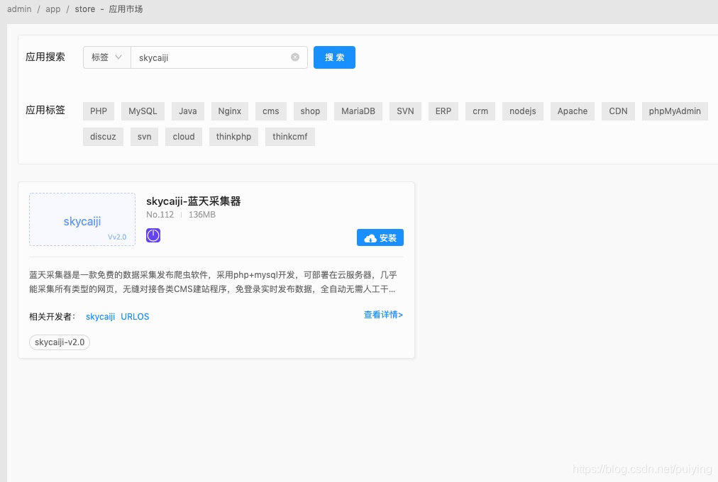 首先安装URLOS,即Docker容器管理面板,请参考官方文档: . 登录URLOS : : 9968(IP是您的服务器的IP,登录的默认用户名和密码均为urlos)在应用程序市场中搜索“ skycaiji”并进行安装,如下所示: