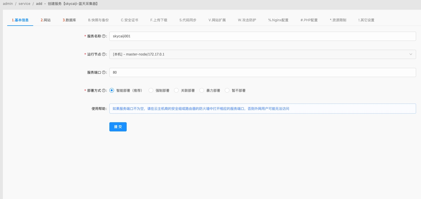 安装过程如下: 1.填写服务名称,服务端口,选择运行节点,然后选择智能部署