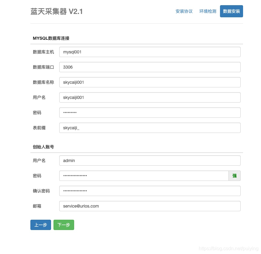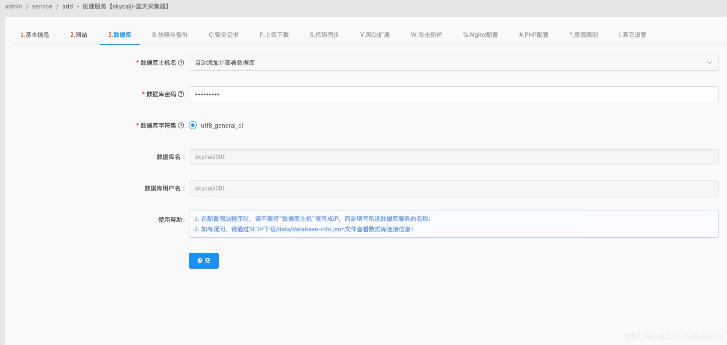 数据库名称和数据库用户名与先前的服务名称一致,并且已在此处自动设置;