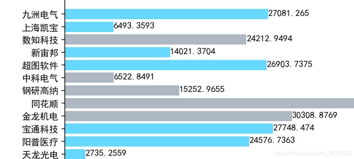 3.根据涨跌的正负值,下跌的股票设置为灰色,上涨的股票设置为蓝色