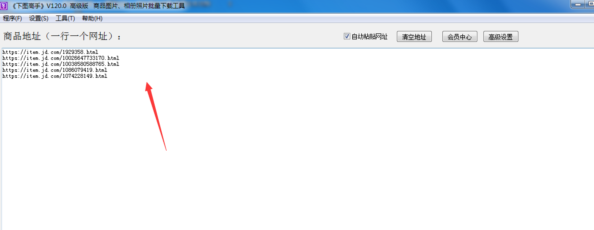 5. 将产品网址复制到软件首页并粘贴,可以每行制作一个网址,复制的网址会自动逐行粘贴