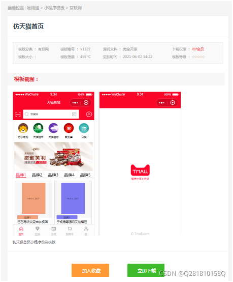 网页的结构如下图所示。这是微信小程序源码的下载页面。您需要获取以下内容: 1 源代码名称(模仿天猫首页);2 获取模板截图地址