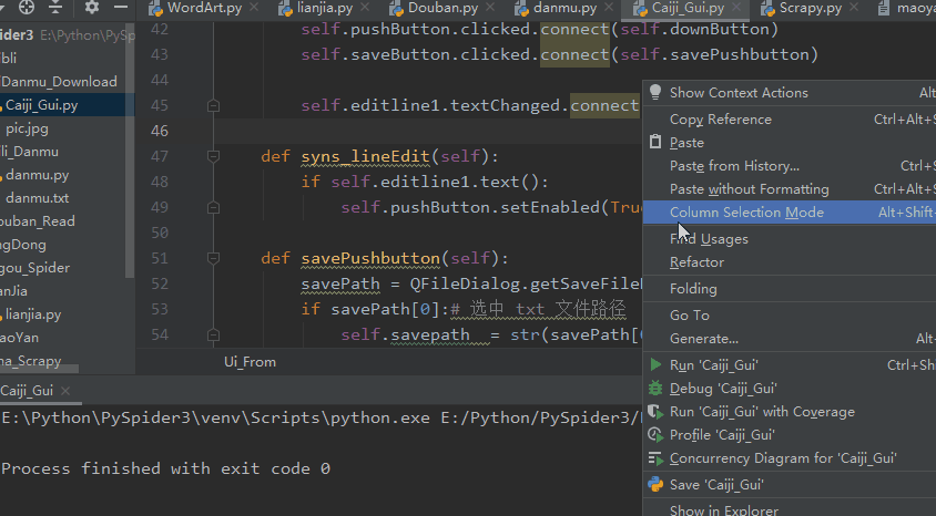 def syns_lineEdit(self):<br /> if self.editline1.text():<br /> self.pushButton.setEnabled(True)#打开按钮<br /><br /> def savePushbutton(self):<br /> savePath = QFileDialog.getSaveFileName(self,'Save Path','/','txt(*.txt)')<br /> if savePath[0]:# 选中 txt 文件路径<br /> self.savepath = str(savePath[0])#进行赋值<br />