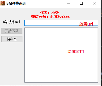 def __init__(self,parent =None):<br /> super(Ui_From,self).__init__(parent=parent)<br /> self.setWindowTitle("B站弹幕采集")<br /> self.setWindowIcon(QIcon('pic.jpg'))# 图标<br /> self.top_label = QLabel("作者:小张\n 微信公号:小张Python")<br /> self.top_label.setAlignment(QtCore.Qt.AlignHCenter)<br /> self.top_label.setStyleSheet('color:red;font-weight:bold;')<br /> self.label = QLabel("B站视频url")<br /> self.label.setAlignment(QtCore.Qt.AlignHCenter)<br /> self.editline1 = QLineEdit()<br /> self.pushButton = QPushButton("开始下载")<br /> self.pushButton.setEnabled(False)#关闭启动<br /> self.Console = QListWidget()<br /> self.saveButton = QPushButton("保存至")<br /> self.layout = QGridLayout()<br /> self.layout.addWidget(self.top_label,0,0,1,2)<br /> self.layout.addWidget(self.label,1,0)<br /> self.layout.addWidget(self.editline1,1,1)<br /> self.layout.addWidget(self.pushButton,2,0)<br /> self.layout.addWidget(self.saveButton,3,0)<br /> self.layout.addWidget(self.Console,2,1,3,1)<br /> self.setLayout(self.layout)<br /> self.savepath = None<br /><br /> self.pushButton.clicked.connect(self.downButton)<br /> self.saveButton.clicked.connect(self.savePushbutton)<br /><br /> self.editline1.textChanged.connect(self.syns_lineEdit)<br />