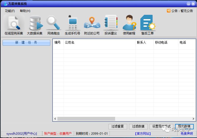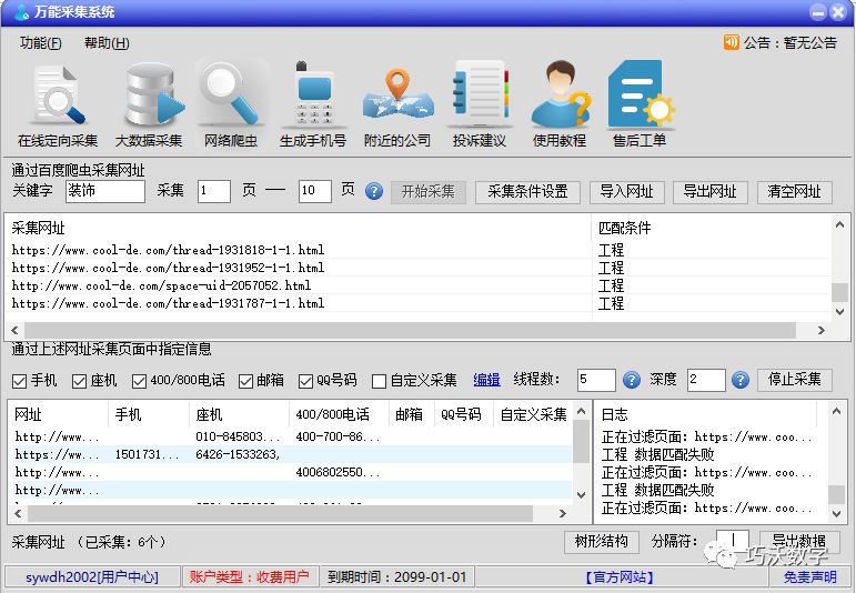 系统支持网络爬虫搜索手机号码的功能。根据您的关键字,用户的手机号码会在网络上智能地公开。目标准确清晰,搜索结果(即手机号码)可以保存在本地。它是在线营销的重要助手。