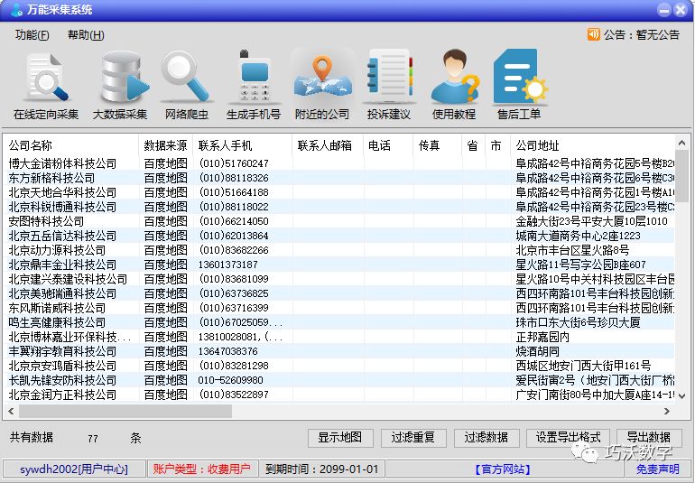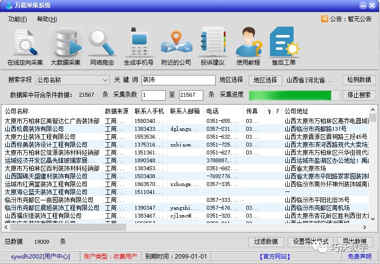该系统可以通过B2B 网站在线访问采集,例如,Marco Polo,Yihu Baiying,中国供应商以及其他B2B 网站 采集最新企业信息,准确的数据,快速的采集,对于获得最新公司信息的客户来说是一个不错的选择。